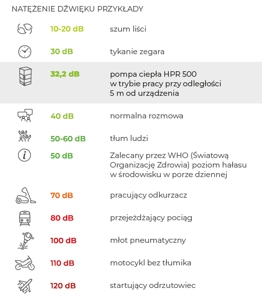 Moc akustyczna pompy mierzona z odległości 5 m to 32,2 dB przy pełnej mocy urządzenia. Praca urządzenia jest bardzo cicha niezależnie od warunków atmosferycznych.