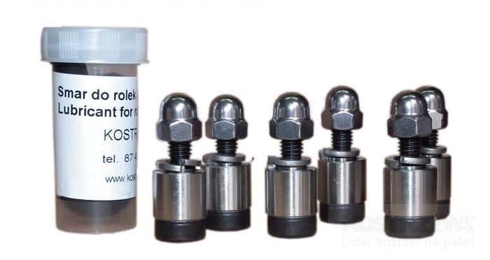 W skład zestawu wchodzi: 6 szt. śruba łeb walcowy imbus, 6 szt. rolek, 6 szt. podkładek sprężystych, 6 szt. nakrętek kołpakowych, 1szt. Opakowanie ze smarem do rolek.